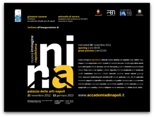 Accademy of Fine Arts of Napoli, in association with Comune di Napoli - Assessor to the Culture presents in the institutional spaces of Pan - Palazzo delle Arti Napoli - the exhibition NINA - New Neapolitan Image by Giovanna Cassese, Marco Di Capua, Francesca Romana Morelli and Valerio Rivosecchi realized by the patronage of Ministero per i Beni and le Attività Culturali and of Ministero dell'Istruzione, dell'Univerisità e della Ricerca. Starting from 21st of november at the historical building of Palazzo Roccella will be occupied by NINA, acronym of New Image Neapolitan, that was born to the Accademy of Fine Arts of Naples. The exhibition it's about the school working and current creativity. It reaps several languages and techique and stiylistics variety, including paintings, sculptures, installations, performances, photografy, videos. As single characters of the one big story the works of artists tell about developings of contemporary art, creating a story that gives a brand new neapolitan artistic image. NINa it's an arrival point of a big growth cultural process and at the same time, a starting point of a new art generation. PAN - Palazzo delle Arti Napoli beacuse of Assessor to the Culture and Tourism of Comune di Napoli, it's the place of contemporary languages. The event will be compose by 44 artists as 84 workers: Afterall , Celesta Bufano, Iole Capasso, Diego Cibelli, Mary Cinque, Chiara Coccorese, Cristina Cubani, Emmanuele De Ruvo Michelangelo Della Morte, Paolo Dell'Aquila, Daniela Di Maro, Adelaide Di Nunzio, Giovanni D'Onofrio, Assunta D'Urzo, Alfonso Fraia, Barbara La Ragione, Christian Leperino, Federico Lombardo, Loris Lombardo, Sandro Maddalena, Domenico Antonio Mancini, Salvatore Manzi , Maram, Gianluigi Maria Masucci, Mediaintegrati, moio&sivelli, Alessio Padano, Carlo Alberto Palombo, Alessandro Papari, Neal Peruffo, Walter Picardi, Paolo Puddu, Francesca Rao, Marco Romano, Raffaella Romano, Anna Maria Saviano, Maria Raffaela Scalfati, Carlotta Sennato, Vincenzo Spagnolo, Paula Sunday, Salvatore Tulipano, Valerio Veneruso, Ciro Vitale, Elpidio Ziello, selected according works quality. Selections of names and works, it's absolutely free and in respect of business, galleries, museums - vital tissue of Napoli contemporanea - to focuse on artists. During the exhibition, will be arranged a series of side events: meetings with artists, gallery managers, writers, critics, film makers, characters of a general NEW NEAPOLITAN IMAGE. Catalogue edited by "Arte'm" with: Luigi De Magistris, Mayor of Napoli, Antonella Di Nocera, Assessor to the Culture del Comune di Napoli, Sergio Sciarelli, Presidente dell'Accademia di Belle Arti di Napoli, Giovanna Cassese, Direttore dell'Accademia di Belle Arti di Napoli, Marco di Capua, Valerio Rivosecchi, Francesca Romana Morelli. |
