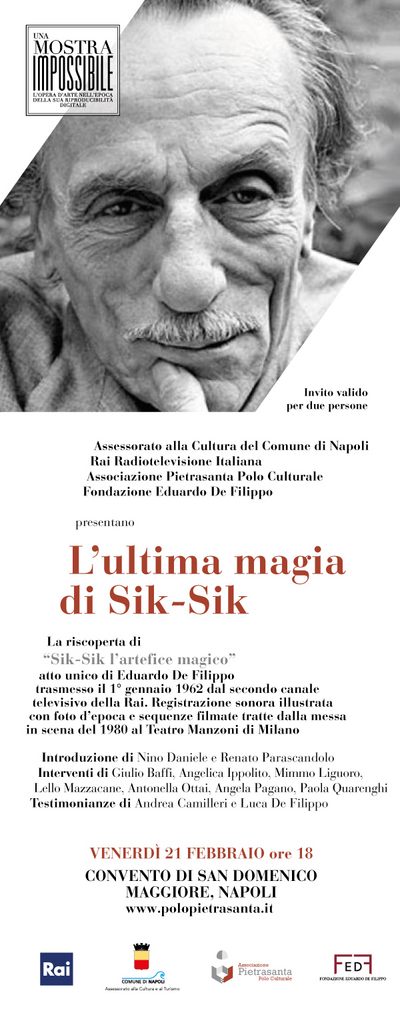 The initiative, which will be accompanied by a speech by Andrea Camilleri (who edited in 1962 the tv programme), is organized by the Department for Culture of the City of Naples in collaboration with RAI, with the Association Pietrasanta Polo Culturale and De Filippo Foundation.The event represents the first event in occasion of the thirty years since Eduardo's death. |