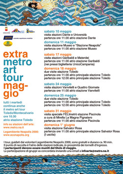 Los voluntarios Legambiente, coordinado por el Deparamento del patrimonio artístico de la metro, para acompañar a los visitantes a descubrir el rico patrimonio del arte contemporáneo del las estaciones del Metro, para ilustrar las características y el significado de cada obra expuesta. Sábado, 31 de Mayo, espacio a las periferias: a las 11:00 horas Mirella del grupo Gridas presenta el tour "FELImetrò". En la estación de Piscinola, la historia del artista Felice Pignataro y su compromiso cultural para Scampia, a través de sus grafitis reproducidos en los espacios de la estación terminal de la Línea 1 del metro.