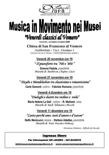 Il Presidente Mario Coppeto e l'Assessore alla cultura Gianpaolo de Rosa comunicano che, nello splendido  scenario di incomparabile  bellezza e ricchezza  artistico-architettonica dell'Eremo del SS. Salvatore ai Camaldoli e della Chiesa di San Francesco di Via L. Giordano, si svolgeranno ben 6 concerti (dall'8 novembre all'11 dicembre) di musica classica e napoletana, eventi  che  caratterizzano da anni le iniziative  culturali della Municipalità Arenella- Vomero.