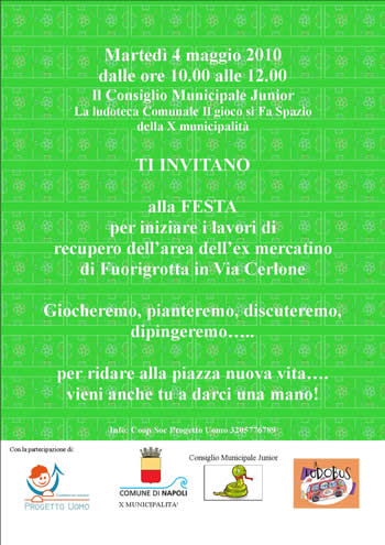 Il Consiglio Junior della X Municipalità avvia un percorso di recupero dell'area di Via Cerlone a Fuorigrotta. Oltre 25 ragazzi rappresentanti delle scuole dell'infanzia e primarie, con la collaborazione della Coop. Progetto Uomo, cominceranno a ridisegnare questo spazio e a dargli una nuova identità.