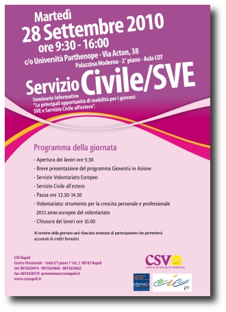 Il CSV Napoli è lieto di invitarvi al seminario sulle opportunità di mobilità per i giovani all'estero con l'approfondimento in particolare delle opportunità del Servizio di Volontariato Europeo e del Servizio Civile all' estero. L'incontro, organizzato in collaborazione con il CEICC Europe Direct Napoli e FOCSIV, sarà anche l'occasione per approfondire la validità e il riconoscimento del volontariato nell'ambito dell' educazione non formale. Vi aspettiamo!