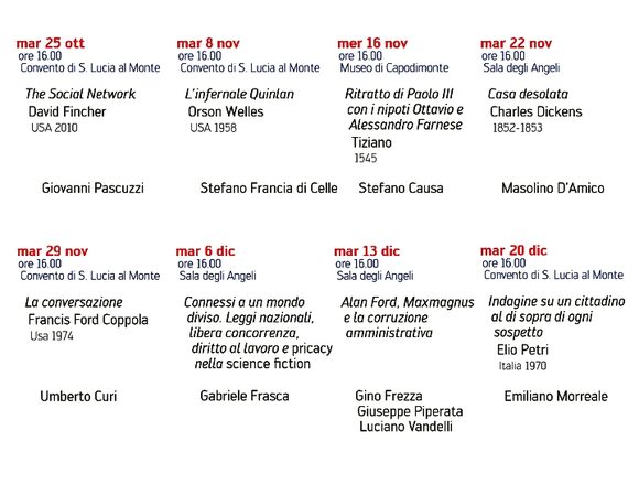 Martedì 25 Ottobre 2011 alle ore 16,00 presso la prestigiosa sede del Convento di Santa Lucia al Monte dell'Università degli Studi Suor Orsola Benincasa di Napoli in C.so V. Emanuele, 334 ter verrà inaugurata la sesta edizione della rassegna "Cinema, Letteratura e Diritto" organizzata dalla Facoltà di Giurisprudenza del Suor Orsola.
