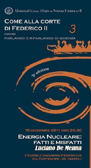 Giovedì 15 dicembre 2011, al Centro Congressi fridericiano di Via Partenope 36, alle ore 20.30, per il ciclo di incontri "Come alla Corte di Federico II - ovvero parlando e riparlando di scienza", Luciano De Menna, professore di elettrotecnica, parlerà di: "Energia nucleare: fatti e misfatti".