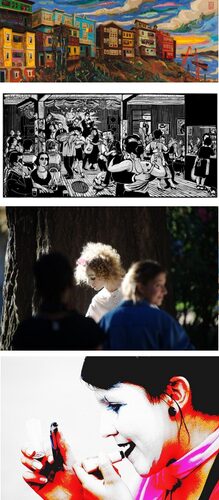 Cosi' Loro Coirón con le sue incisioni in bianco e nero e Gonzalo IIabaca con i suoi dipinti esuberanti di colori, materializzano, davanti a noi, due visioni complici e complementari di una stessa Valparaiso, il Porto che aveva gia' incantato il Premio Nobel Pablo Neruda e Ruben Dario, che scrisse qui "Azul" , la sua opera piu' significativa. Il Curatore Giuseppe Ussani d'Escobar afferma: "Gonzalo Ilabaca, con le sue opere, ricrea davanti ai nostri occhi una Valparaiso allucinante e visionaria, una città in grado di generare e deformare i sogni. I suoi "Ni adentro ni afuera" e "No tienes corazon" vedono al centro un personaggio che riempie lo spazio, che media il rapporto tra l'osservatore ed il luogo, quasi un custode-guida-guardiano di quel mondo onirico." ed ancora "Loro Coiron cerca continuamente un suo codice di linguaggio per esprimere il suo stupore di fronte alla magia di Valparaiso, sembra trovarlo, ma poi lo abbandona poiché la realtà di Valparaiso è in perpetua metamorfosi, non si stabilizza mai creando nell'artista quell'ansia di espressione che pochi luoghi nel mondo riescono a favorire".