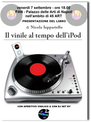 Nello splendido scenario del PAN di Napoli, nell'ambito della mostra 45 ART, verrà presentato il libro: "Il vinile al tempo dell'iPod" di Nicola Iuppariello, ideatore di DiscoDays | Fiera del Disco e della Musica, con gli interventi di Carmine D'Onofrio, curatore della mostra 45 ART, Pino Imparato, collezionista ed esperto dei Pink Floyd e del critico musicale Fernando Fratarcangeli che ne ha scritto la prefazione.