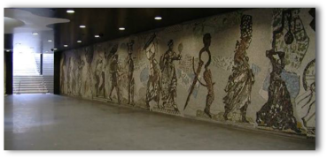 Nella stazione, profonda quasi 50 metri con un volume di 43.000 metri cubi, il succedersi dei colori sottolinea e rimarca, man mano che si scende, i diversi livelli di profondità: il nero della terra, l'ocra del tufo, l'azzurro del mare. Durante i lavori di scavo sono emersi notevoli testimonianze del passato dell'antica città, dal primo suolo arato del paleolitico (il calco è attualmente al Museo Nazionale) fino alle murazioni di epoca aragonese restaurate e integrate nelle finiture di stazione; reperti archeologici e opere d'arte contemporanea sono ora affiancati negli spazi interni. La luce naturale penetra fino in profondità, attraverso tronchi di cono a sezione esagonale che entreranno a far parte dell'arredo urbano di questa nuova piazza.