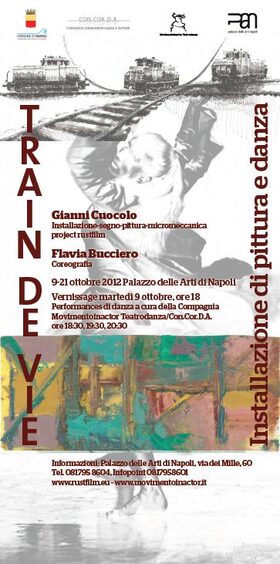 Inaugura martedì 9 ottobre, alle ore 18, presso il Palazzo delle Arti di Napoli in via dei Mille, 60, l'installazione di pittura e danza TRAIN DE VIE di Gianni Cuocolo (installazione-segno-pitturamicromeccanica) e Flavia Bucciero (coreografia), realizzata in collaborazione con il Comune di Napoli (assessorato alla Cultura e al Turismo) e il Palazzo delle Arti di Napoli. L'installazione sarà esposta dal 9 al 21 ottobre 2012.