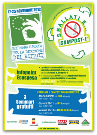 Iniziative organizzate nella Settimana Europea per la Riduzione dei Rifiuti (SERR) nell'ambito del progetto Sballati e... compost-i!: - Infopoint Ecospesa: dal 19 al 22/11 (ore 9.00/20.00) c/o la COOP di via Arenaccia, Napoli. I prodotti ecosostenibili ed i consigli dagli Esercizi commerciali di Napoli e provincia aderenti al progetto Sballati e... compost-i! - 3 Seminari gratuiti su Come fare il Compostaggio domestico: martedì 20/11 e giovedì 22/11 (ore 16:30/17:30) presso IKEA (Afragola). Venerdì 23/11 (ore 16:30/17:30) presso LEROY MERLIN (Afragola). Organizzato da: ANEA e COMUNE DI NAPOLIIn collaborazione con: IKEA, LEROY MERLIN, UNICOOP Tirreno"P.S. Per la partecipazione gratuita ai Seminari sul compostaggio domestico ci si può prenotare all'indirizzo: www.anea.eu/serr12/reg_anea.htm. |