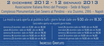 San Severo al Pendino dal 2 dicembre 2012 al 12 gennaio 2013 La mostra sarà aperta al pubblico tutti i giorni feriali dalle ore 9.00 alle ore 18.30 Inaugurazione 2 dicembre 2012 ore 10.30 Ingresso Gratuito |