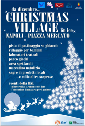 Mercoledì 19 dicembre alle ore 17.30 a Piazza Mercato, alla presenza dell'assessore alle Attività Produttive del Comune di Napoli Marco Esposito e del Presidente del Consiglio Provinciale Luigi Rispoli, si accenderanno le luci sul "Christmas Village On Ice" col suo parco giochi e le befane acrobatiche di Urbania, la pista sul ghiaccio ed oltre venti stand allestiti dalle associazioni del territorio ed espositori dell'artigianato. Sarà la luce a led ecologica di Enel Sole ad "accendere" l'intero villaggio. La società del Gruppo Enel che opera nei settori dell'illuminazione pubblica e artistica ha infatti messo a disposizione dell'evento sette pali con quattordici lampade "Archilede", basate sull'innovativa tecnologia a led che garantisce risparmio energetico ed economico e un'illuminazione di qualità. L'iniziativa vede anche il supporto di BNL che proprio a Piazza Mercato ha aperto il suo primo sportello di microcredito del Sud Italia. L'evento è reso possibile grazie al lavoro dell'Associazione Milcham, al coinvolgimento delle associazioni Aige, AssoGioca e Movimento Protezione Civile Insieme e della Chiesa di Santa Croce al Mercato. "Per la prima volta - ha dichiarato l'assessore Esposito - abbiamo coinvolto l'intero quartiere che ha risposto con entusiasmo partecipando e supportando il lavoro di organizzazione. Con l'occasione ringrazio gli sponsor e le associazioni del territorio".