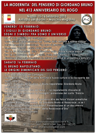 Venerdì 15 e sabato 16 febbraio 2013 dalle 16 alle 19.30 presso l'Antisala dei Baroni al Maschio Angioino, in occasione del 413 anniversario della morte del filosofo nolano, a cura del "Forum delle Antiche e Nuove Culture" si svolgerà una due giorni di incontri al centro dei quali sarà evidenziato il legame di Giordano Bruno con la città di Napoli.