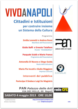 Per contribuire a questa "reazione" hanno costituito l'Associazione "Vivoanapoli", che si propone come luogo di riflessione e di provocazione aperto al dialogo con tutti quanti - istituzioni, organizzazioni private e singoli cittadini - intendono impegnarsi a favore del rilancio della città, valorizzando le enormi risorse culturali presenti nel territorio.