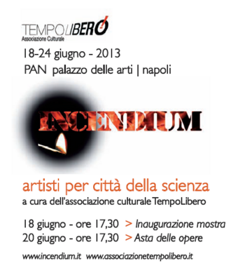 Martedì 18 giugno alle ore 12,00 nella sede del PAN al secondo piano si terrà la conferenza stampa, accesso su invito, sulla Mostra-Asta INCENDIUM che si aprirà il pomeriggio alle ore 17,30. Saranno presenti: l'Assessore alla cultura del Comune di Napoli, Nino Daniele, Maria Lorenzi della Commissione cultura del Comune di Napoli, Linda Irace presidentessa dell'Associazione Tempolibero, Fabio de Chirico Soprintendente per i Beni Storici, Artistici ed etnoantropologici della Calabria e dell'Umbria, Luigi Amodio, Direttore Generale Fondazione IDIS-Città della Scienza, Annamaria Schena, Delegata pari opportunità Unione Industriali della provincia di Napoli, Pompeo Paparo, editore del catalogo e i 139 artisti che hanno contribuito a realizzare l'evento. Segue aperitivo.