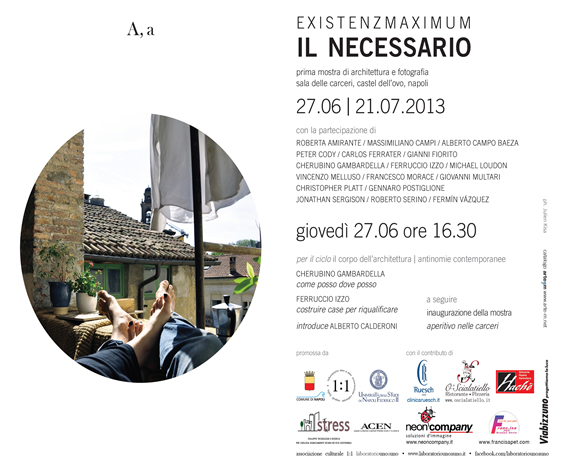 Giovedì 27 giugno alle ore 16.30 si inaugurerà, presso la Sala delle Carceri di Castel dell'Ovo a Napoli, la mostra "EXISTENZMAXIMUM. Il NECESSARIO", prima mostra di architettura e fotografia organizzata dall'associazione culturale "1:1 laboratoriounoauno" promossa dall'Assessorato alla Cultura e al Turismo del Comune di Napoli e dall'Università degli Studi di Napoli "Federico II" e dal Distretto Tecnologico per le Costruzioni Sostenibili STRESS.