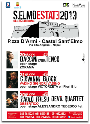 Regione Campania, Comune di Napoli, le Associazioni culturali "Napoli Jazz" e "Napoli Motus" presentano la VI edizione della rassegna musicale "S. Elmo Estate", kermesse estiva dedicata al mondo delle 7 note, tra le più attese e amate in città. Ancora una volta lo splendido scenario architettonico, storico, naturale della Piazza d'Armi di Castel Sant'Elmo, da giovedì 20 giugno sino a lunedì 24 giugno ospiterà tre appuntamenti di elevato spessore artistico. Si parte con il cantautorato d'autore di Francesco Baccini e il suo recital "Baccini canta Tenco" (giovedì 20 giugno). Open stage: Zorama. E si proseguirà con Giovanni Block "Vadino signori vadino", open stage Victorzeta e i fiori blu (venerdì 21 giugno). Gran finale lunedì 24 giugno con Paolo Fresu Devil Quartet "Desertico" (open stage: Alessandro Tedesco 4et). Come da tradizione, anche quest'anno, il direttore artistico della rassegna Michele Solipano offre ad alcune giovani realtà del panorama musicale napoletano (Zorama Victorzeta e i Fiori Blu, Alessandro Tedesco) la possibilità di aprire gli eventi per rendere ancora più coinvolgenti le serate. |