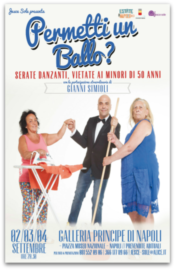 Tre serate per la gente, per chi vuole divertirsi e non sempre ha la possibilità di farlo, per regalare a chi non è più giovanissimo tanti sorrisi: questo è lo spirito con cui Gianni Simioli animerà la kermesse, lo stesso spirito irriverente con cui conduce il programma "La Radiazza" , un programma che da voce ai napoletani. Parlando dei problemi, delle bellezze, della quotidianità della città partenopea, con ironia, simpatia, e spesso sollevando anche polemiche e dibattiti costruttivi, "La Radiazza", in onda tutti i giorni su Radio Marte, è la trasmissione più seguita dal pubblico campano, superando di gran lunga persino le trasmissioni dedicate al calcio. Chissà se la baraonda Simioli porterà più scompiglio o divertimento tra le coppie danzanti? Sarà una bella sfida e, a proposito di gara , nell'ambito delle tre serate si terrà un miniconcorso: sarà premiata la "Coppia simpatia", la "Coppia eleganza" e naturalmente la coppia che dimostrerà di essere la "Migliore coppia danzante" . Non resta che dire " Permetti un ballo?" e ricordare che le serate sono vietate ai minori di 50 anni!