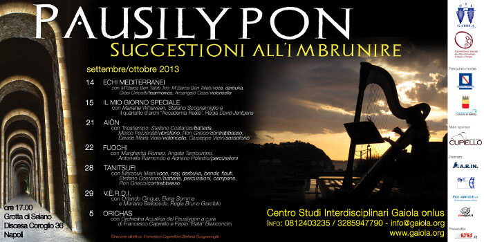 Storia, natura, musica e teatro nuovamnete insieme per  il nuovo calendario autunnale dell'ormai consolidata rassegna del Pausilypon, curata dal Centro Studi Interdisciplinari Gaiola onlus, d'intesa con la Soprintendenza Speciale ai Beni Archeologici di Napoli e Pompei e con il Patrocinio del Comune di Napoli e Regione Campania. Sette nuovi appuntamenti arricchiti dalla presenza di ospiti internazionali quali la cantante e compositrice tunisina M'Barca Ben Taleb ed il regista olandese David Jentgens. Accanto a loro le melodie e la voce dell'avanguardia culturale del mondo teatrale e musicale napoletano con i Tricatiempo, Margherita Romeo, Elena Somma e Mariano Bellopede, solo per citarne alcuni.