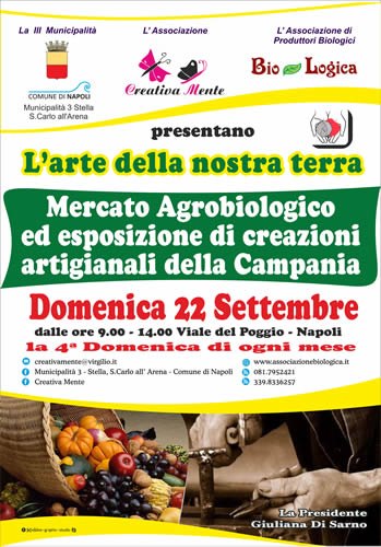 La 3° Municipalità ha organizzato la 4^ domenica di ogni mese mercatini dell'artigianato e prodotti biologici per promuovere il nostro artigianato, aiutare i piccoli produttori, animare il territorio, promuovere la filosofia del mangiar bene, muovere una piccola economia. Tutto questo nell'ottica di uno sviluppo territoriale possibile, tra gli obiettivi principali di questa amministrazione municipale. Oltre 20 artigiani e più di 15 aziende agroalimentari ravviveranno le domeniche, a partire da DOMENICA 22 Settembre, tra olive e formaggi di pecora, fave e fagiolini sott'olio, salami selezionati ed ortaggi di stagione sarà possibile apprezzare l'opera, la creatività e l'ingegno di lavori semplici, unici e opera dell'ingegno e della creatività di