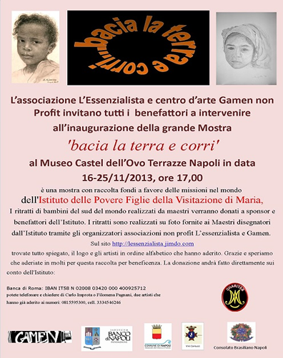 Il 16 novembre ore 17,00 al Castel dell'Ovo di Napoli sarà inaugurata la mostra solidale con ritratti d'autore dei "meninos de rua", organizzata dall'Associazione "L'Essenzialista" e dal Centro d'Arte "Gamen"