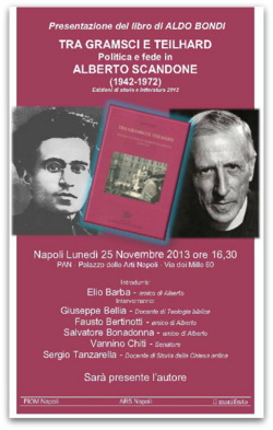 Lunedi' 25 novembre alle ore 16.30, presso il PAN / Palazzo Arti Napoli si terrà l'incontro pubblico e presentazione del libro di Aldo Bondi: "Tra Gramsci e Teilhard; politica e fede in Alberto Scandone" Intervengono: Elio Barba, Giuseppe Bellia, Fausto Bertinotti, Salvatore Bonadonna, Vannino Chiti, Sergio Tanzarella. Sara' presente l'autore. |