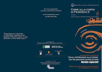Giovedì 8 maggio 2014, presso l'Auditorium dell'Osservatorio Astronomico di Capodimonte, in Salita Moiariello 16, alle ore 20.30, per il ciclo di incontri "Come alla Corte di Federico II - ovvero parlando e riparlando di scienza", Massimo Capaccioli, professore di astronomia e astrofisica presso l'Università degli Studi di Napoli Federico II, parlerà di: "Dagli Appennini alle Ande. Un telescopio napoletano."
