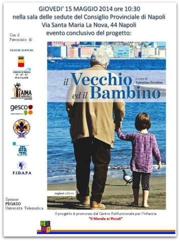 Giovedì 15 Maggio 2014 ore 10.30 nella sala delle sedute del Consiglio Provinciale di Napoli - Via Santa Maria La Nova, 44 - Napoli si terrà la presentazione del catalogo "Il vecchio ed il bambino" ROGIOSI Editore, (2014). Il catalogo è il risultato del lavoro svolto durante il III° Progetto solidale intitolato "Il vecchio ed il bambino" realizzato dal Centro Polifunzionale per l'Infanzia Impresa Sociale "Il Mondo ai Piccoli " di Napoli. Il Progetto ha promosso un percorso di crescita che ha permesso di costruire, attraverso testimonianze esemplari, nuovi legami ed appartenenze tra il "vecchio" ed il "nuovo", sviluppando emozionanti opportunità pedagogiche. Protagonisti del progetto, i bambini dell'ultimo anno della scuola dell'Infanzia e della Primaria delle scuole della III, IV, V Municipalità, con la partecipazione straordinaria della II e VII Municipalità.