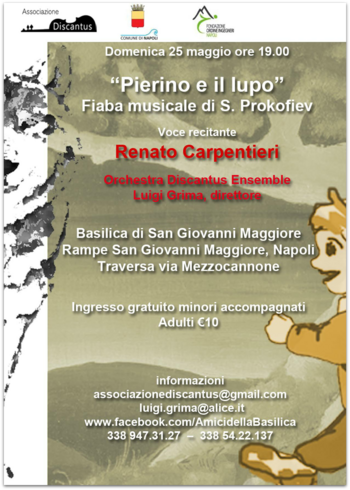 Programma Nino Rota Fantasia da Il Padrino, Amarcord, Romeo e Giulietta "Pierino e il lupo" Fiaba musicale di S. Prokofiev Ingresso gratutito minori accompagnati Adulti 10 Basilica di San Giovanni Maggiore, Rampe san Giovanni maggiore, traversa via Mezzocannone Informazioni: associazionediscantus@gmail.com - luigi.grima@alice.it |