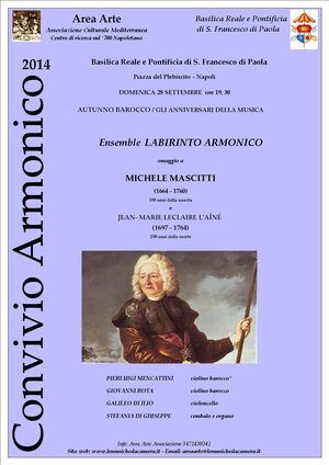 Violinista e compositore abruzzese di scuola Napoletana, oggetto da tempo di una sensibile opera di riscoperta e divulgazione, fu attivo a Napoli in gioventù benchè la sua lunga vita si svolgesse poi a Parigi dove fu uno dei maggiori divulgatori dello stile italiano in Francia. La proposta concertistica, affidata allo storico ensemble abruzzese LABIRINTO ARMONICO, fondato e diretto dal violinista pescarese Pierluigi Mencattini con Giovanni Rota al violino, Galileo Di Ilio al violoncello, e Stefania Di Giuseppe al clavicembalo, si completa, quasi come in un gioco di specchi riflessi, con una Sonata di Jean- Marie Leclaire, uno dei maggiori violinisti-compositori francesi, ma divulgatore dello stile musicale e violinistico Italiano, del quale ricorrono i 250 anni dalla morte.