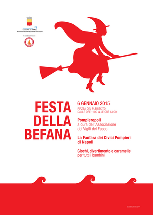 Torna martedì 6 gennaio, dalle ore 11.00 alle ore 13.00, in piazza del Plebiscitol'appuntamento con la grande festa della Befana, organizzata dall'Assessorato all'Istruzione del Comune di Napoli e dal Comando Provinciale di Napoli dei Vigili del Fuoco che anche quest'anno ha rinnovato il proprio impegno a rendere speciale un giorno così amato dai bambini.La Civica Fanfara dei Pompieri, alla presenza del Sindaco di Napoli Luigi de Magistris, aprirà la Festa alle ore 11.00 e, a seguire, fino alle 13.00, grazie all'Associazione Nazionale dei Vigili del Fuoco, sarà allestita Pompieropoli, un percorso ideato e dedicato ad insegnare ai piccoli protagonisti la sicurezza attraverso attività ludiche. In piazza ci saranno sorprese per i più piccoli, anche grazie alla Befana che scenderà come di consueto a regalare caramelle a tutti.