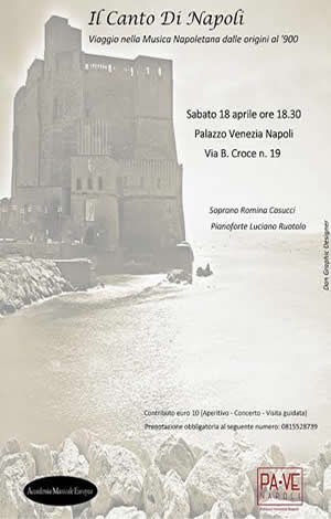 Il concerto si terrà nella Casina Pompeiana dello splendido Palazzo Venezia Napoli che accoglierà gli ospiti nei suoi affascinanti spazi, dopo l'aperitivo di benvenuto il pubblico sarà immerso nel viaggio musicale che partirà dalle Villanelle del '500, passando per l'Opera Buffa, la Musica da Camera fino alla Canzone Classica Napoletana del '900.