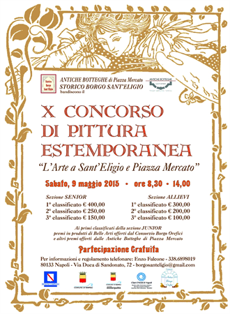 capacità al servizio di una zona che nella dimenticanza generale, sa però in queste occasioni essere l'unica in città che vanta tante manifestazioni spontanee d'arte. L'associazione Storico Borgo Sant'Eligio ed il Consorzio Antiche Botteghe Tessili (dal 2006 è presente sul territorio) sono insieme nel percorso di promozione e sviluppo della zona Mercato. Anche quest'anno la manifestazione è aperta a tutti gli artisti con l'invito ai tanti studenti delle scuole di formazione artistica di partecipare anche e soprattutto per andare a scoprire una bella parte di città dove troveranno le chiese di Sant'Eligio, di San Giovanni a mare, Croce al Mercato e Santa Maria del Carmine, che tra le proprie mura hanno visto passare molta della storia della città e la grande piazza Mercato che dai dipinti di Micco Spadaro del '600 ad oggi è immutata nella sua funzione di raccordo tra i traffici commerciali e la città. Una vocazione spenta lentamente per le insipienti scelte politiche, ma ricercata con forza e passione da chi in questa zona ci ha passato la vita con imprese e botteghe, ed ecco che anche questa occasione perora con decisione la costituzione del Museo Laboratorio di Arte Tipografica, che rivolto ai giovani con la costituzione di una cooperativa, metterà il patrimonio della Tipografia Falcone al servizio della memoria per un arte che dal '500 ad oggi ha permesso di stampare libri, di ampliare la conoscenza, come l'estemporanea che offre nuova conoscenza dei luoghi storici ai tanti che qui non sono mai venuti, e sicuramente sarà una sorpresa ed una gioia condividere la passione e l'amore per l'arte e la propria città.