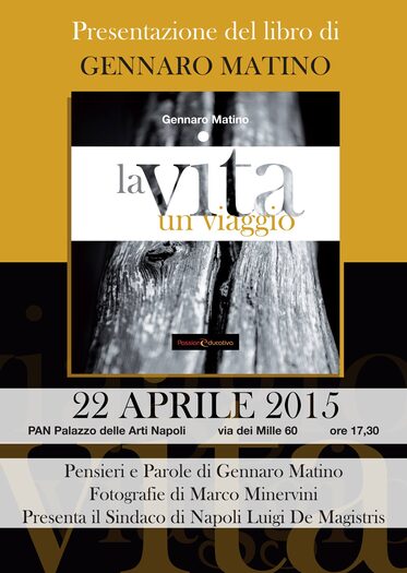 Mercoledì 22 aprile alle ore 17.30, presso il Palazzo delle Arti di Napoli (Sala Convegni piano 3), in via Dei Mille n. 60, si presenta il nuovo libro di Gennaro Matino, "La vita: un viaggio", edito da Passione Educativa, un percorso di pensieri e parole sul significato vero e profondo della vita, supportato dalle evocative immagini di un giovane fotografo partenopeo, Marco Minervini, che provano a dare corpo ai pensieri dell'autore, animando quelli del lettore.