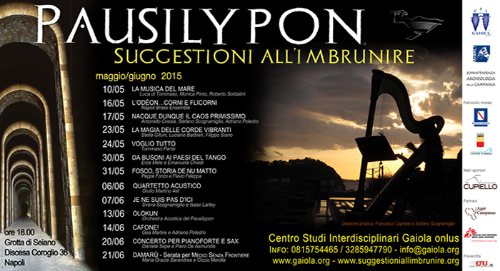 Giunta alla sua VII Edizione, la manifestazione, ideata e curata dal Centro Studi Interdisciplinari Gaiola Onlus, d'intesa con la Soprintendenza Archeologia della Campania e con il Patrocinio della Regione Campania e dell'Assessorato alla Cultura del Comune di Napoli, si ripropone come raffinato incontro tra archeologia, natura, musica e teatro nella straordinaria cornice dell'antica Villa D'Otium, del I Sec a.C., di Publio Vedio Pollione. Dal 10 maggio al 21 giugno, tredici appuntamenti per riscoprire l'incanto del Pausilypon al tramonto, accompagnati dai suoni, le melodie e la voce dell'avanguardia culturale teatrale e musicale napoletana, per la direzione artistica di Francesco Capriello e Stefano Scognamiglio. |