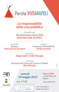 E' Raffaele Del Giudice, Amministratore Unico di Asia, il primo ospite del nuovo ciclo di incontri su "La Responsabilità della Cosa Pubblica", promosso dall'Associazione VIVOANAPOLI. Si terrà venerdì 29 maggio, ore 17.00, nella Sala conferenze del PAN. Partecipa lo scrittore Maurizio De Giovanni. Emilia Leonetti, Presidente di VIVOANAPOLI modererà il confronto. Domande a cura di Diego Guida e Fabio Pascapè. Interviene l'Assessore alla Cultura del Comune, Nino Daniele. I cittadini sono invitati a partecipare. Info: è previsto l'accredito stampa. Per richiederlo, inviare email di conferma a e_leonetti@alice.it, o telefonare a 329-3178568 |