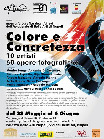 Materia: solida, liquida, gassosa, le sue forme con le quali interagiamo senza pensarci. Lo sguardo dell'artista, però, l'indaga ogni giorno, la ricerca, c'interagisce con le tecniche che predilige. Sono Monica Iengo, Annarita Di Costanzo, Carmine Esposito, Kija Giandomenico, Angelo Mozzetta, Antonia Manna, Tecla Bianco, Ocar Cetrangolo, Maria Saggese, Pierpaolo Maracas i 10 giovani fotografi in fase di formazione presso l'Accademia di Belle Arti di Napoli che hanno raccolto la sfida lanciata dai curatori della mostra Marta di Meglio ed Aniello Barone e sono stati selezionati per esporre nella sala foyer del PAN, Palazzo delle Arti di Napoli dal 28 maggio al 6 giugno. Due le particolarità che contraddistinguono l'indagine sulla materia di questi giovani artisti: la prima è relativa al colore, le immagini in mostra, infatti, mettono in risalto 6 specifici colori: giallo, blu, rosso, verde, viola, arancione; la seconda è che in fase di presentazione ad ogni artista è stato chiesto di descrivere l'essenza di ogni scatto con un breve testo, volto a spiegare il perché del soggetto scelto e del colore che si è deciso di utilizzare. Un vero lavoro di ricerca, dunque, una scelta volta a creare delle vere e proprie riflessioni materiche. |