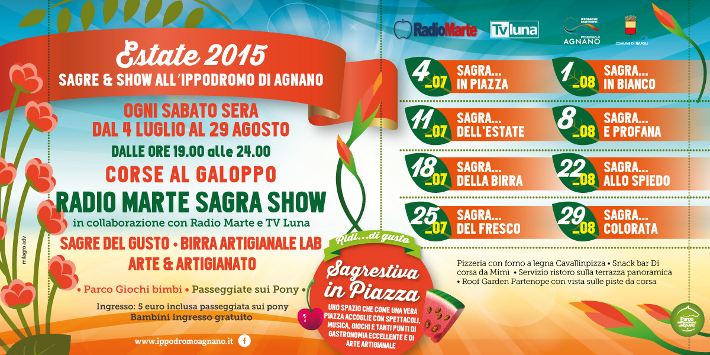 Da sabato 4 luglio sono tornati a grande richiesta i sabato sera d'estate all'Ippodromo di Agnano, dedicati alle famiglie e agli appassionati di trotto e di galoppo (dalle ore 19.00 a mezzanotte, ingresso 5 euro, bambini gratis, ogni sabato sera di luglio e agosto escluso sabato 15).