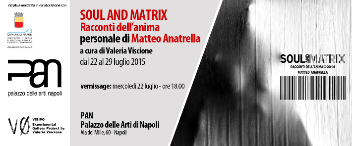 Si inaugura mercoledì 22 luglio, alle 18.00, la  mostra fotografica "Soul and Matrix - Racconti dell'anima" di Matteo Anatrella. La mostra a cura di Valeria Viscione sarà visitabile fino al 29 luglio nel Foyer del PAN - Palazzo delle Arti Napoli (Via dei Mille, 60 - Napoli). Matteo Anatrella fonde tecnica fotografica ad interventi grafici e manuali, col fine di ottenere  immagini dinamiche, connubio tra stile e ricerca. Anatrella punta a coinvolgere gli spettatori nel processo creativo dei suoi progetti fotografici, per questo predilige la live perfomance, grazie alla quale riesce ad entrare in contatto con il pubblico, che diventa parte stessa dei suoi lavori.