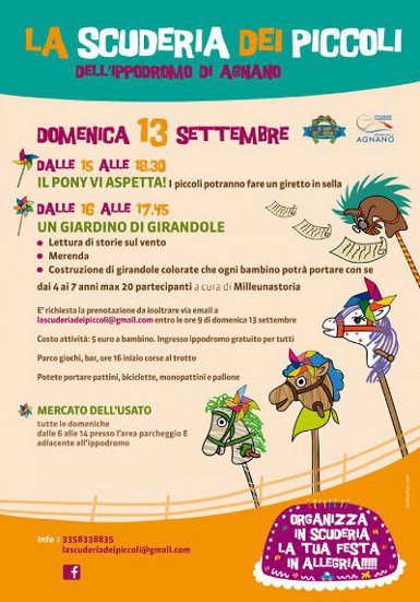Domenica 13 settembre torna la Scuderia dei Piccoli all'Ippodromo di Agnano con attività ludico ricreative per i bambini (ingresso gratuito all'ippodromo dalle ore 15.00, costo per la partecipazione alle attività euro 5/bambino da prenotare inviando una e-mail entro le ore 9.00 della domenica a: lascuderiadeipiccoli@gmail.com oppure 335 833 88 35).