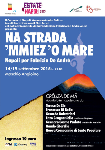Assessorato alla Cultura - Club Tenco con il patrocinio morale della Fondazione De André. Consulenza Artistica di Dori Ghezzi De André. Creuzâ de mä in napoletano. Eloquente il titolo dell'operazione, che si avvale della consulenza artistica di Dori Ghezzi, con cui si propone una rivisitazione in napoletano di tutti in brani di "Creuzâ de mä", riproposto da 7 gruppi di artisti napoletani trasversali ai generi e alle generazioni. Consulenza Artistica di Dori Ghezzi De Andrè. Direzione culturale / condirezione artistica Annino La Posta. Coordinamento e comunicazione / condirezione artistica Dario Zigiotto. Proiezione di fotografie sul tema dell'immigrazione e del Mediterraneo a cura di Stefano Renna. |
