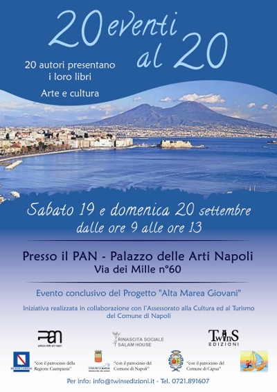 • Sabato 19 e domenica 20 settembre si svolgerà un weekend napoletano all'insegna dei libri e della cultura. Due giorni ricchi di eventi nella suggestiva cornice del PAN, Palazzo delle Arti di Napoli, che spesso ospita iniziative artistiche e letterarie e che ha sede nel settecentesco Palazzo Roccella, luogo che offre spazi espositivi, spazi di consultazione, servizi e strumenti per l'incontro e lo studio delle opere e degli autori dell'arte contemporanea.