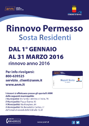 5. bollettino postale di 10,00 su C/C postale 19562800 intestato a A.N.M. s.p.a. via G. Marino, 1 80125 Napoli (indicare nella causale "Permesso sosta residenti anno 2016" e il numero di targa dell'autovettura) oppure