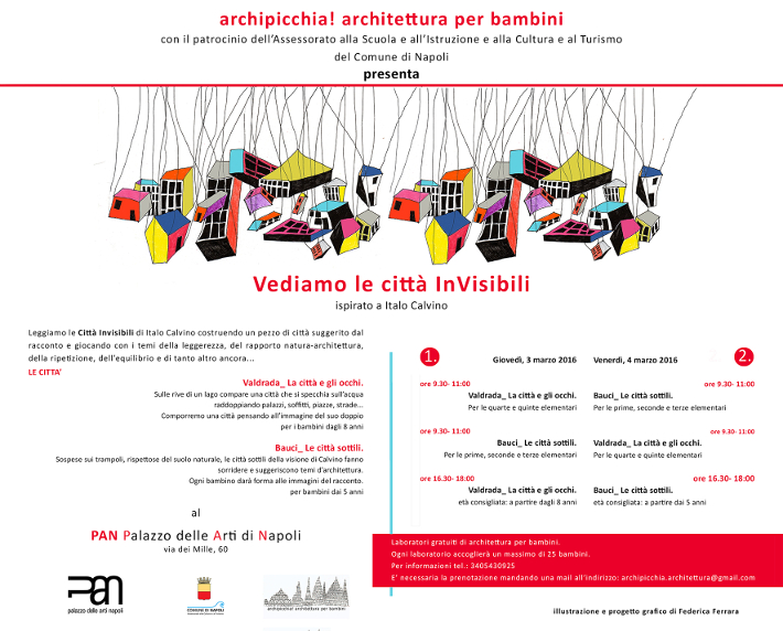 Laboratori a cura dell'Associazione Culturale Archipicchia_Architettura per Bambini. Ciclo di laboratori di architettura tratto da "Le Città Invisibili" di Italo Calvino. Un dialogo tra arte, architettura e letteratura attraverso la ri-scrittura architettonica del testo di Calvino. Una lettura capace di dare "spessore" tridimensionale all'opera letteraria. In collaborazione con gli assessorati alla Cultura e al Turismo del Comune di Napoli e alle Scuole e all'Istruzione. |