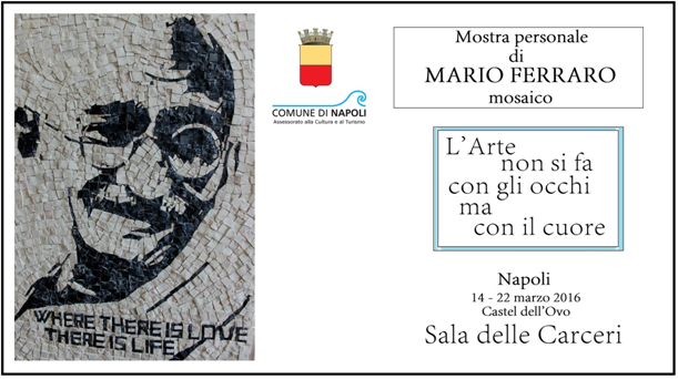 E interessante, e a suo modo suggestiva è innanzitutto la figura dell'artista: autodidatta e neofita dell'arte del mosaico, Ferraro è un ipovedente che ha scelto di sfidare il suo handicap con la tecnica artistica che esige più di ogni altra la cura certosina del dettaglio. L'arte musiva, deputata al decoro, alla materia che si fa spazio partendo dal particolare, dal colore che informa e vivifica, è per sua natura "arte paziente, degna della Muse", ma si fa eccezionalmente portavoce, nella persona dell'artista torrese, dei disagi della Maculopatia, una patologia che induce una riduzione notevole delle capacità visive e, dunque, della capacità di discriminazione dell'immagine. Un lavoro, dunque, quello di Mario Ferraro, marittimo, operaio e artista, che, sfidando a viso aperto i colpi della sorte, fa di questa sfida il terreno stesso della ricerca artistica e lo proclama: "l'arte si fa col cuore, non con gli occhi!". Ospitiamo il lavoro di Ferraro all'inizio della primavera ed i uno dei luoghi più belli di Napoli; un momento e un luogo ben auguranti per far conoscere ai napoletani ed ai tanti turisti, che
