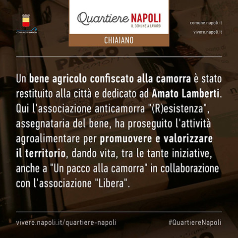 - Un bene agricolo confiscato alla camorra è stato restituito alla città e dedicato ad Amato Lamberti. Qui l'associazione anticamorra "(R)esistenza", assegnataria del bene, ha proseguito l'attività agroalimentare per promuovere e valorizzare il territorio, dando vita, tra le tante iniziative, anche a "Un pacco alla camorra" in collaborazione con l'associazione "Libera".