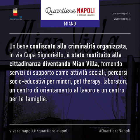 - Un bene confiscato alla criminalità organizzata, in via Cupa Signoriello, è stato restituito alla cittadinanza diventando Mian Villa, fornendo servizi di supporto come attività sociali, percorsi socio-educativi per minori, pet therapy, laboratori, un centro di orientamento al lavoro e un centro per le famiglie.