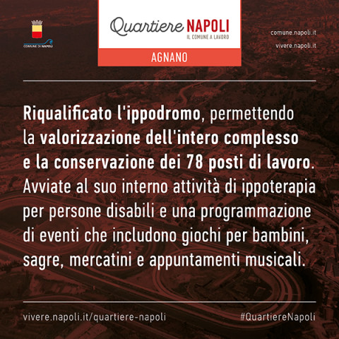 - Riqualificato l'ippodromo, permettendo la valorizzazione dell'intero complesso e la conservazione dei 78 posti di lavoro. Avviate al suo interno attività di ippoterapia per persone disabili e una programmazione di eventi che includono giochi per bambini, sagre, mercatini e appuntamenti musicali.