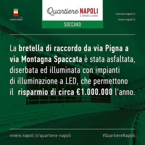 - La bretella di raccordo da via Pigna a via Montagna Spaccata è stata aslfaltata, diserbata ed illuminata con impianti di illuminazione a LED, che permettono il risparmio di circa 1.000.000 l'anno.