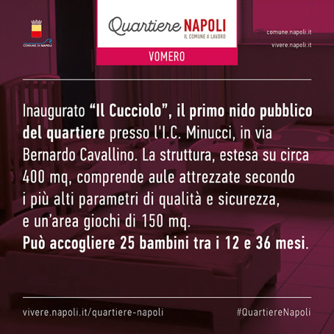 - Inaugurato "Il Cucciolo", il primo nido pubblico del quartiere presso l'I.C. Minucci, in via Bernardo Cavallino. La struttura, estesa su circa 400 mq, comprende aule attrezzate secondo i più alti parametri di qualità e sicurezza, e un'area giochi di 150 mq. Può accogliere 25 bambini tra i 12 e i 36 mesi.