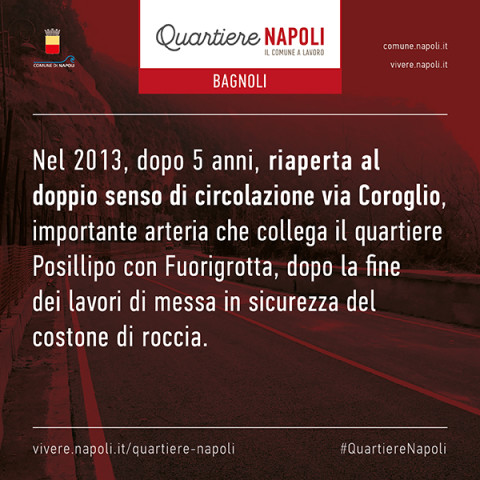 - Nel 2013, dopo 5 anni, riaperta al doppio senso di circolazione via Coroglio, importante arteria che collega il quartiere Posillipo con Fuorigrotta, dopo la fine dei lavori di messa in sicurezza del costone di roccia.